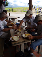 Sentados a tablas dimos buena cuenta de un suculento desayuno, donde el chorizo y el quesito se llevaron las palmas. Por ahí (término plagiado a algunos futbolistas) el Lobato se salió de la fila y pidió carnita de cerdo cuñada con arepa talla eme y porción de arroz recién secado; lástima que los frisoles los “alzaron” tarde, o sino un cucharonado de los mismo habría hecho el cuarto, ideal para cuidar la dieta, cuya intención siempre comienzo el primero de enero de cada año. Las amables señoras que atienden el entable nos despidieron con un “Bueno muchachos, por aquí los esperamos para el almuerzo, les tenemos mondongo o bandejitas con todo y que Dios los cuide”